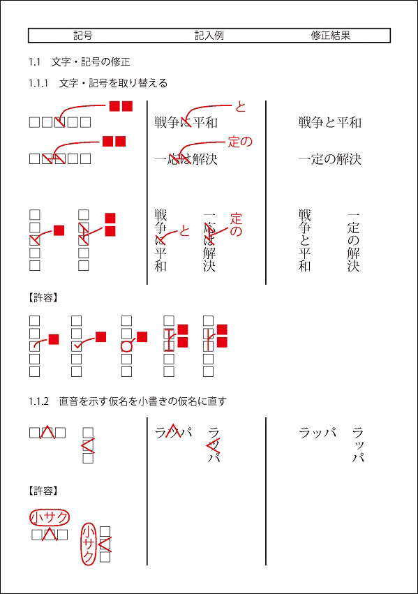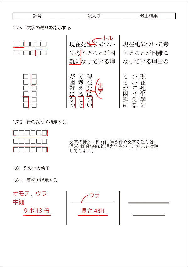 印刷物・出版物も工業製品の一種ですから、校正記号は日本工業規格(JIS)によって厳密に定められています。間違っている文字を正しい文字にあらためる〈だけ〉のことだと言ってしまえばそれまでですが、その指示が不適切だと印刷物・出版物の内容はめざすものには近づきませんし、書籍制作の工程に遅滞を生じる場合がないとも限りません。「わかればいい」ではなく、しっかりとわからせるために指示を伝えるように心がけましょう。